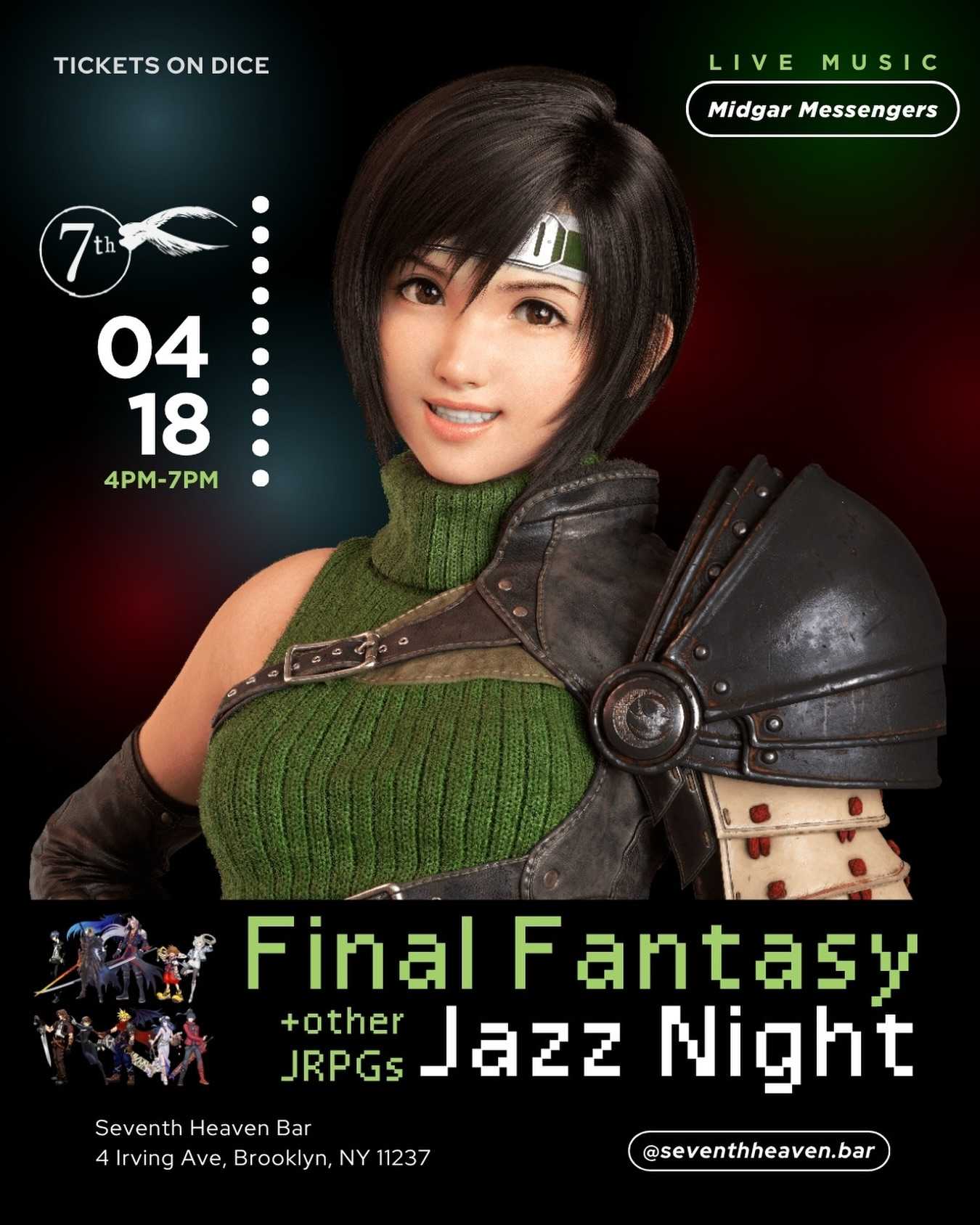 Final Fantasy jazz night is BACK on Saturday, April 18th as a weekend matinee! Join the Midgar Messengers for a night of live jazz covers live at Seventh Heaven Bar & Karaoke (say hi to Tifa for me)